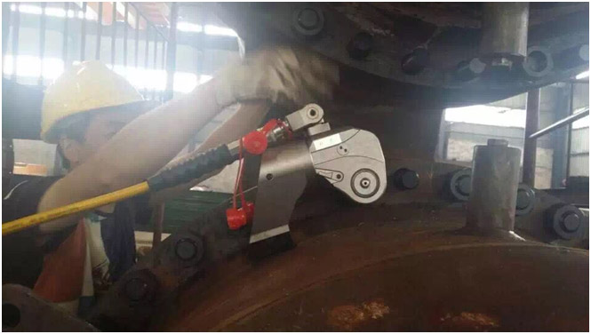 聚頂機(jī)械針對(duì)化工廠裝備公司的情況,派遣了有現(xiàn)場(chǎng)經(jīng)驗(yàn)的技術(shù)員前往查看,現(xiàn)場(chǎng)工況相對(duì)不是很復(fù)雜,標(biāo)配的液壓扳手就能解決,但也存在較為特殊的情況,如法蘭連接處不是平面,夾角不是垂直或者工作空間狹小等情況,聚頂機(jī)械公司從用戶的角度出發(fā),給出的解決方案不光滿足工作要求,還要為客戶節(jié)約成本,所以針對(duì)化工廠裝備公司常規(guī)以及特殊的現(xiàn)場(chǎng)情況聚頂機(jī)械公司采用一套液壓扳手就能解決全部問(wèn)題的方案,得到客戶的高度認(rèn)可。由于現(xiàn)場(chǎng)工人不會(huì)使用液壓扳手,聚頂機(jī)械技術(shù)人員就手把手教操作人員,直到都能熟練操作為止,同時(shí)在現(xiàn)場(chǎng)工人的要求下,用液壓扳手裝配一套壓力容器,最后還要加水打壓檢測(cè)是否泄漏,一切都超出了工人們的預(yù)料,大家都說(shuō)以后有了液壓扳手他們心里有底多了,以后就不再全部依賴“風(fēng)炮”了,技術(shù)主管人員也說(shuō)使用液壓扳手后交付給客戶的產(chǎn)品,他們就放心了。